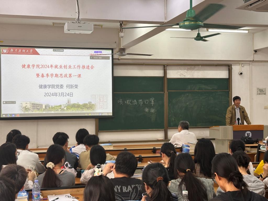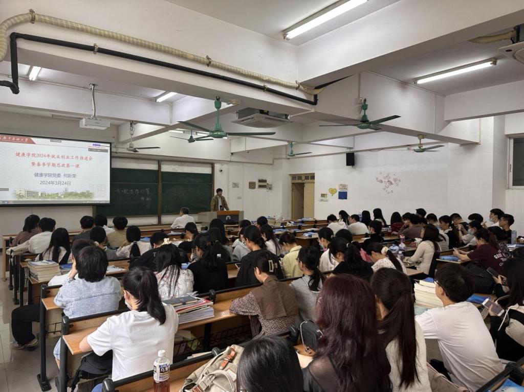 2024年3月24日上午,为切实推进落实2024届毕业生的就业指导工作,为毕业生提供更好的就业指导服务,健康学院党委召开了2024年就业创业工作推进会暨春季学期思政第一课。本次会议由学院党委书记何新荣主讲,学生党支部书记李章维主持,学院党委副书记李叶青、康复治疗学专业2024届全体毕业生参加,会议结合具体情况采用线上线下方式同时进行。