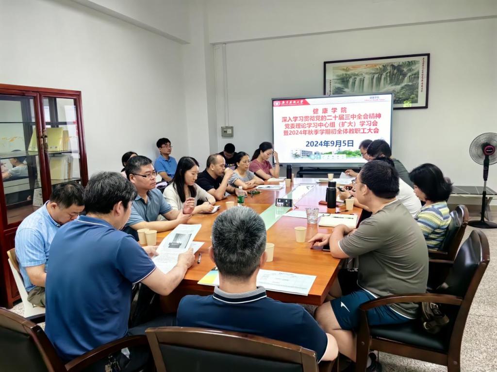 2024年9月5日上午,健康学院在赤岗校区综合楼三楼会议室召开“深入学习贯彻党的二十届三中全会精神党委理论学习中心组(扩大)学习会暨2024年秋季学期初全体教职工大会”,会议由健康学院李国标副院长主持。
