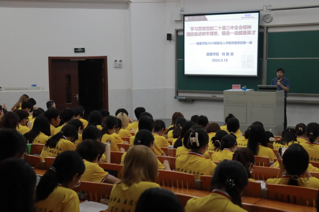 学院党委书记何新荣向健康学院2024级新生讲授了题为《学习贯彻党的二十届三中全会精神,团结奋进树牢理想,锻造一流健康英才》的“思政第一课”。何新荣书记首先与同学们一起学习了党的二十届三中全会精神,全面学习了党的二十届三中全会通过的《中共中央关于进一步全面深化改革、推进中国式现代化的决定》。指出党的二十届三中全会就是在“两个大局”下召开的具有里程碑意义的大会,强调党和国家事业发展对高等教育的需要,对科学知识和优秀人才的需要,比以往任何时候都更为迫切,勉励同学们要明确我们所处的时代位置,锚定青春的坐标,珍惜当下、把握现在、走好未来的每一步,鼓励同学们要坚定理想信念,努力励志成才,积极在健康事业的发展舞台上发光发热。
