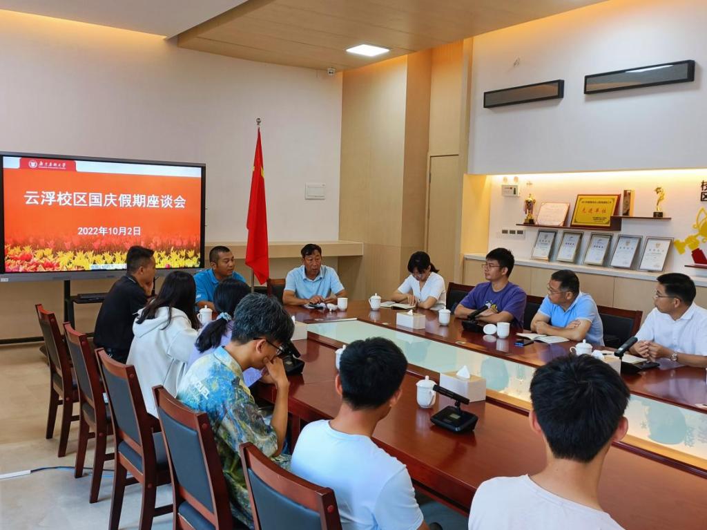 10月2日下午,我校云浮校区举行国庆假期座谈会。座谈会由学校黎锦城副校长主持,健康学院党总支副书记刘雨文老师、云浮校区国庆假期留校学生代表等40余人参加了座谈会。