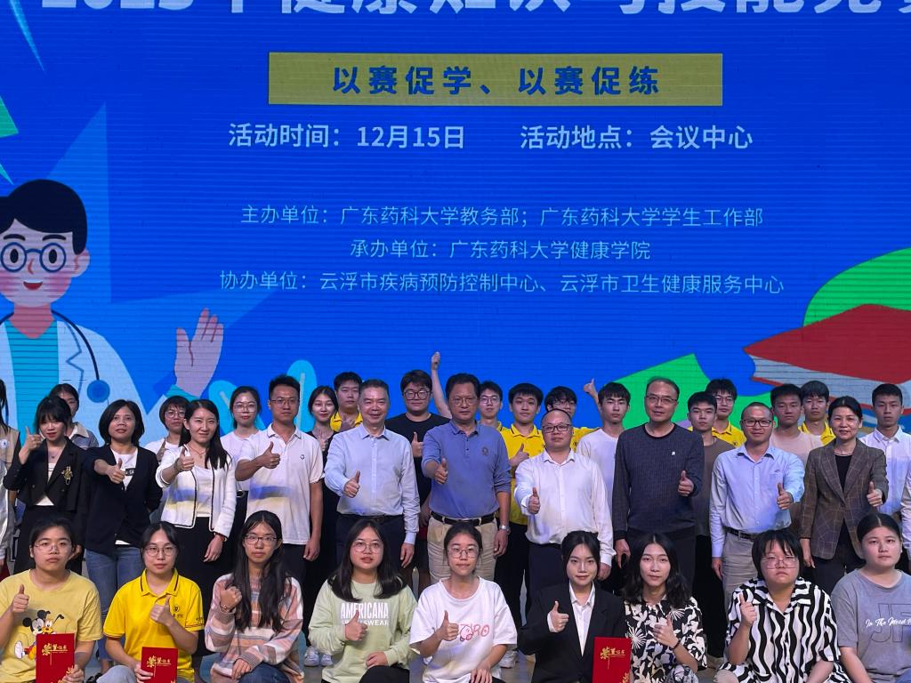 2023年12月15日下午,由广东药科大学教务部、广东药科大学学生工作部主办,广东药科大学健康学院承办,云浮市疾病预防控制中心、云浮市卫生健康服务中心协办的广东药科大学2023年健康知识与技能竞赛在我校云浮校区会议中心圆满落下帷幕。本次大赛分健康宣讲、健康运动、健康新媒体、健康问答四个赛道,来自云浮校区各学院共54名选手进入决赛,其中健康宣讲5支队伍共15人,健康运动4支队伍共29人,健康问答共10人。云浮市卫生健康局、云浮市疾病预防控制中心、云浮市卫生健康服务中心的相关领导,云浮校区办,校区各学院相关领导出席了开幕式,300多名学生现场观看了比赛。