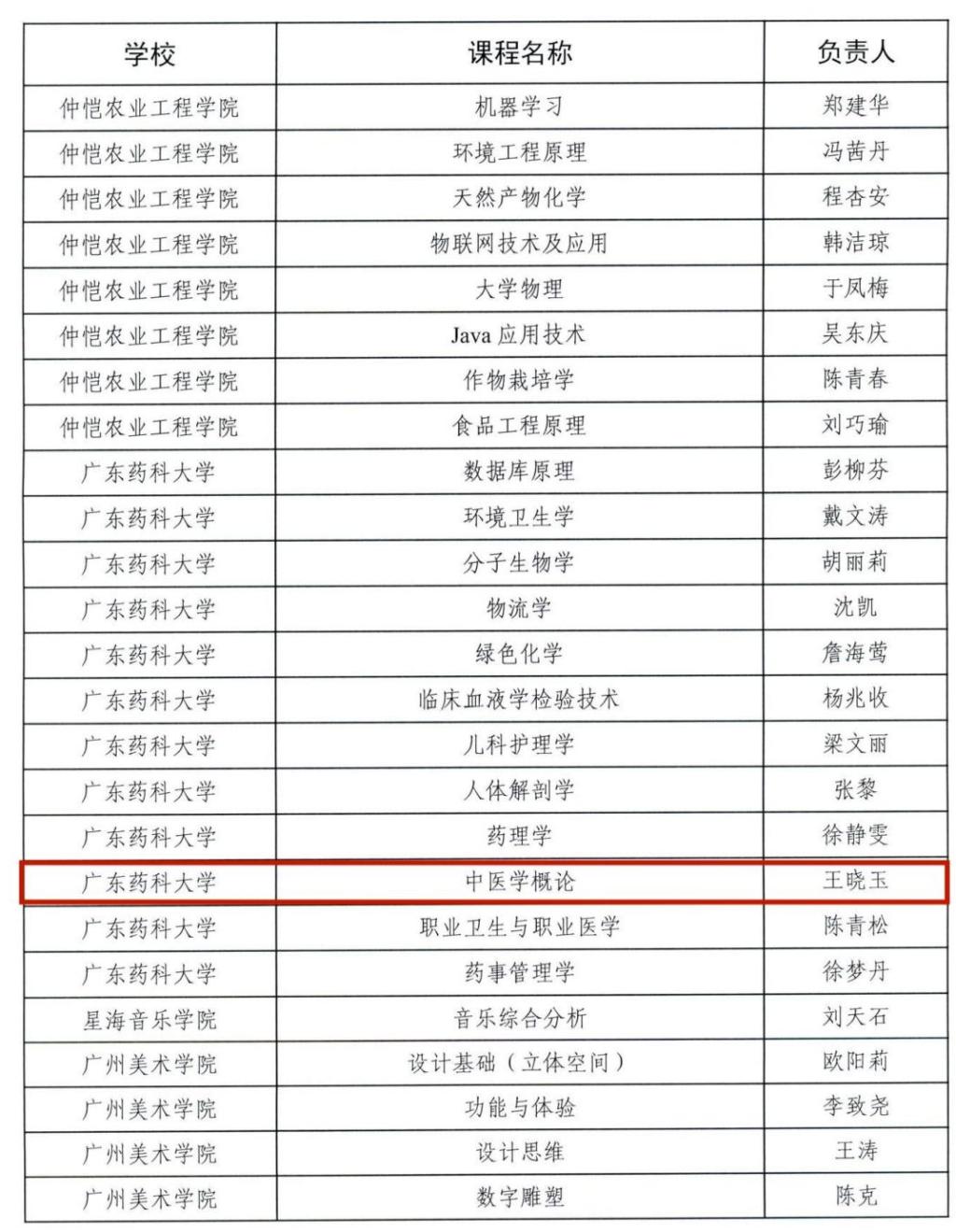 近日,广东省教育厅发文公布了2023年度省级一流本科课程认定结果,我院王晓玉老师主讲的《中医学概论》入选线上线下混合式一流课程。这是继赵昌林老师主讲的《语言治疗学》入选省级线下一流课程之后,我院的第二门省一流课程。