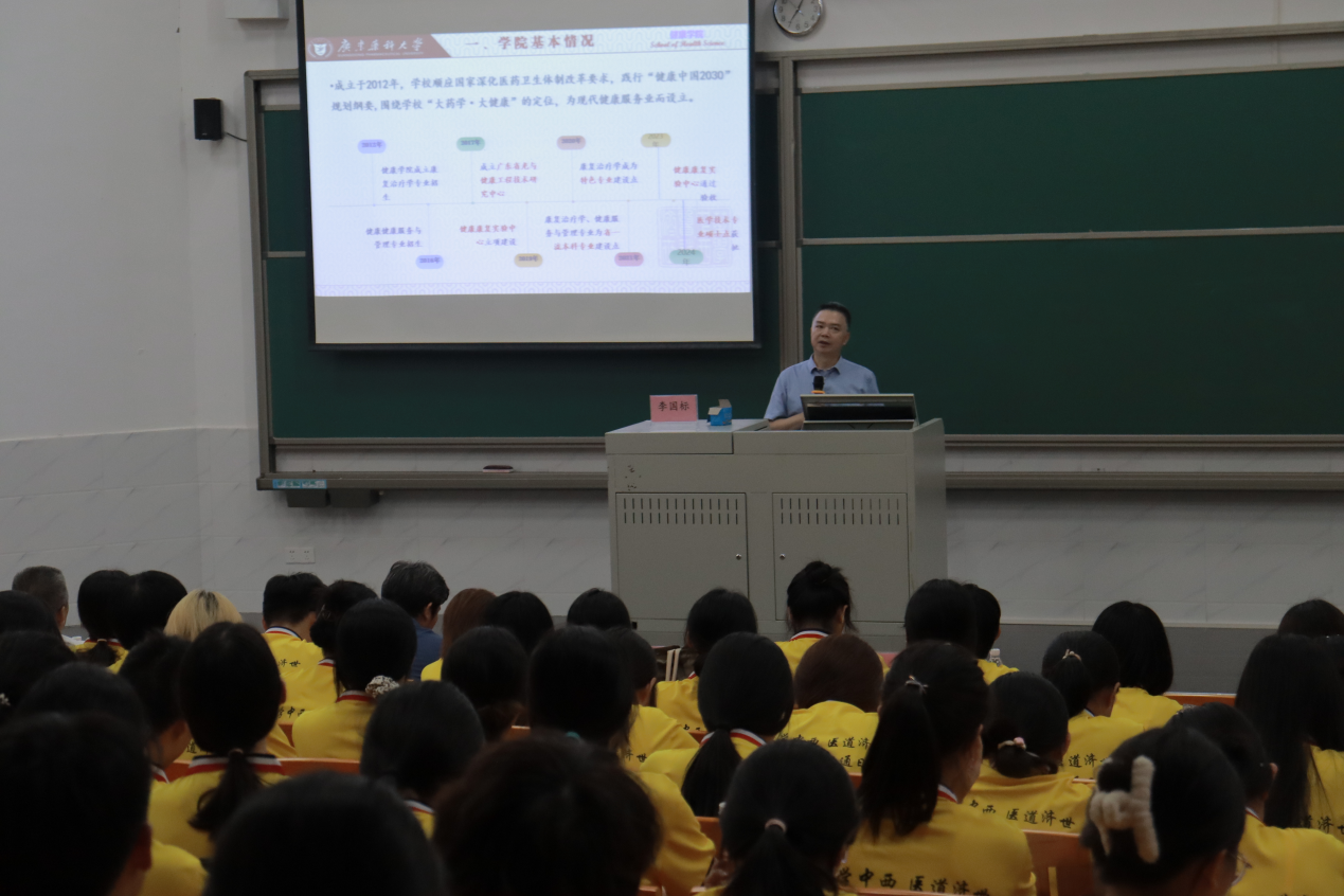学院副院长李国标首先作了题为《携手共筑健康中国梦》的报告。李国标指出,健康学院是学校顺应国家深化医药卫生体制改革要求,践行“健康中国2030”规划纲要,围绕学校“大药学·大健康”的定位,为现代健康服务业而设立。重点介绍了学院现有的康复治疗学和健康服务与管理两个专业和2024年获批医学技术专业硕士点的建设情况,鼓励同学们刻苦学习、努力钻研,为将自己培养成健康管理和康复方面的高级专业技术人才作出自己应有的努力,为建设健康中国战略的实施贡献自己的智慧和力量。
