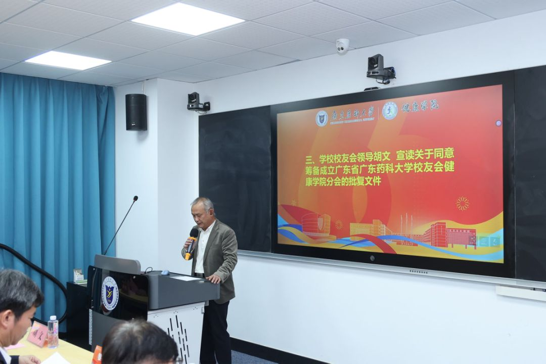 大会在庄严的国歌声中拉开帷幕。校友会秘书长胡文代表广东药科大学校友会宣读了《关于同意筹备成立广东省广东药科大学校友会健康学院分会的批复》文件。健康学院副院长李国标作学院发展情况汇报,何新荣代表校友会健康学院分会筹备组介绍了分会筹备成立工作情况。